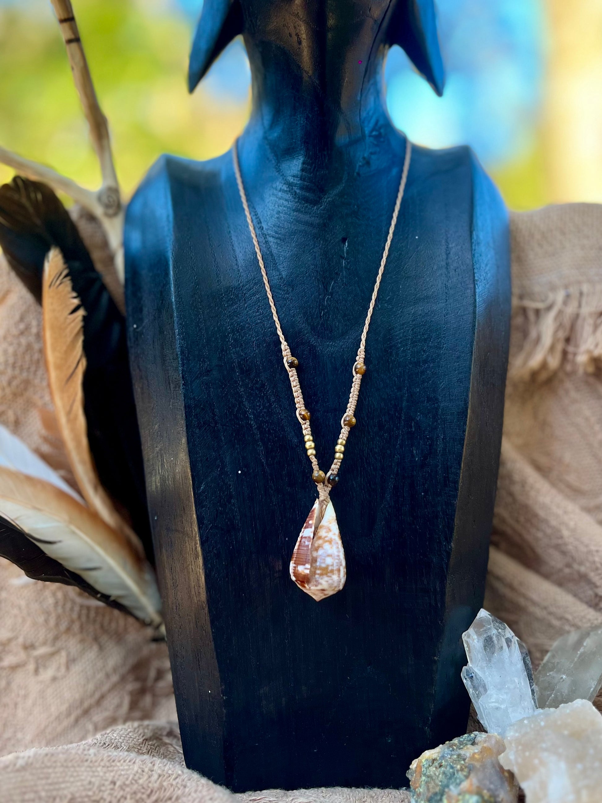 Ce collier artisanal célèbre l'harmonie entre terre et océan. Confectionné en fil ciré 0,75mm, il présente au centre un coquillage Conus connu sous le nom d'œil de l'océan. Véritable amulette protectrice, encadré de part et d'autre par des perles d'œil de tigre et de laiton. Le Conus, coquillage aux propriétés défensives reconnues, éloigne les énergies négatives et cultive la sérénité profonde. L'œil de tigre, placé en symétrie, renforce cette action protectrice tout en apportant clarté et ancrage, tandis que le laiton confère une luminosité chaleureuse et une patine authentique. Cette composition équilibrée et structurée crée une présence minérale forte. Réglable pour tous les cous, ce bijou incarne la protection océanique pour qui désire une amulette élégante et intemporelle au quotidien.