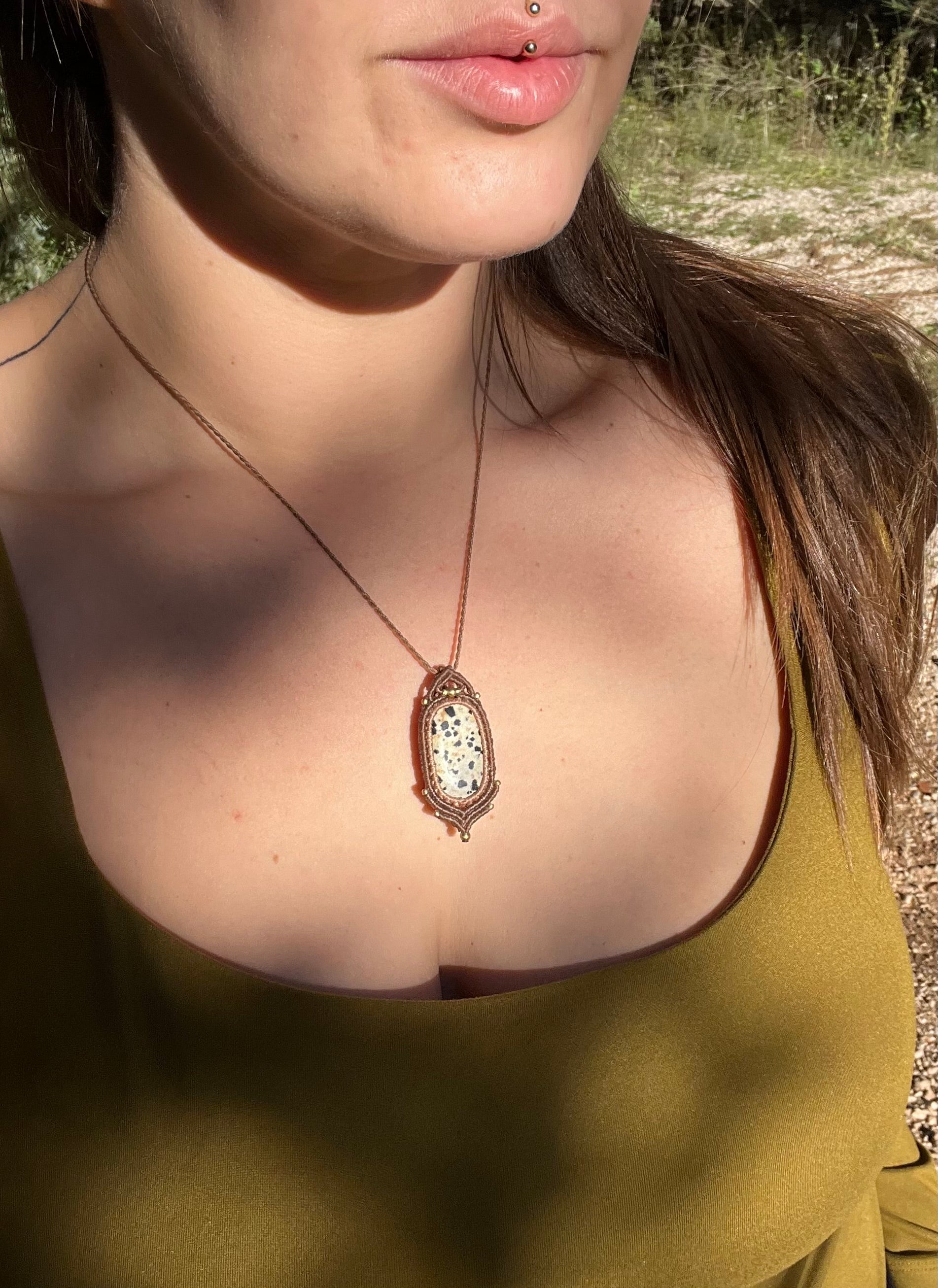 Ce collier artisanal incarne la pureté minérale du jaspe dalmatien. Confectionné en fil ciré 0,75mm, il présente une pierre de jaspe dalmatien en position centrale, marquée par ses inclusions noires caractéristiques sur fond beige, accompagnée de perles en laiton qui structurent l'ensemble. Le jaspe dalmatien, pierre de sérénité et d'équilibre, cultive l'harmonie psychique et l'enracinement énergétique profond. Ses teintes naturelles et ses motifs organiques composent une palette minérale chaleureuse et intemporelle. Le laiton, disposé symétriquement, confère une luminosité dorée et développe une patine authentique au fil du port. Réglable pour tous les cous, ce bijou exprime la raffinement minéral pour celui qui recherche une présence sereine et stable.